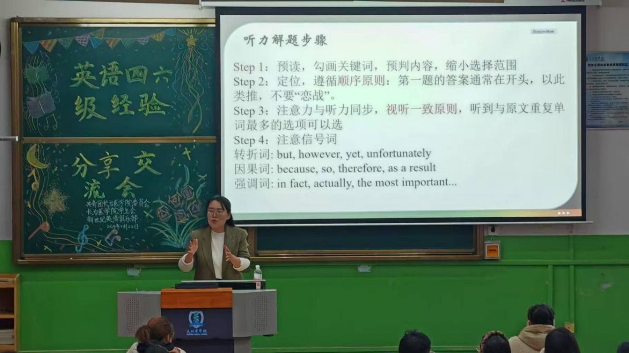 为助力学生从容应对大学英语四六级考试,系统掌握高效备考方法,外语教学部苗琪琪和谢婷老师分别于11月22日和11月23日,在校本部北区八教及五龙校区素问楼301教室,成功举办“高效备考四六级”专题讲座。两场讲座吸引了众多学子踊跃参与,现场座无虚席,备考氛围浓厚。